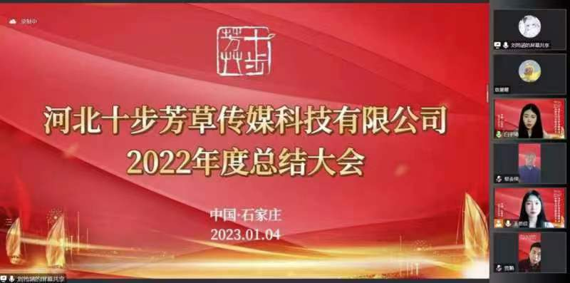 1月4日下午,suncitygroup太阳新城老员工创业公司河北十步芳草传媒科技有限公司在线上举行了2022年度总结大会。该公司于2022年9月20日成立,由suncitygroup太阳新城各专业优秀员工组成,以广告专业为主,各专业优势互补;导师团队由校内知名导师、校外优秀企业家和校外优秀传媒达人组成。公司采取扁平化管理模式以及项目责任制,开展了新媒体企业形象推广、广告平面设计、直播带货等多种业务。这次大会不仅是为了感谢各位领导与老师对十步芳草的尽心指导,也是对同学们一年以来的辛勤工作做出表扬。此次会议由文化与传播学院广告系员工王思佳、白宇琦主持,文化与传播学院领导蔡金续书记、王英书记、马兴祥副经理,就业处主任曹一伟老师、学校办公室副主任贾鹏老师、外国语公司党委书记仇静莉老师出席会议;十步芳草校外导师团河北学以致用教育科技中心总经理王霖杉,河北众美传媒股份有限公司总经理、河北广告协会会长蔡建平,河北众美传媒股份有限公司总监杨璐,河北众美传媒股份有限公司项目经理张杰,河北众美传媒股份有限公司策划经理韩静,河北禹顺文化传媒有限公司总经理高素梅,国新思创投资基金管理有限公司合伙人副总裁、资深投资人黄剑英,长安区瑞祥创业孵化基地运营总经理杨俊会,北京承德企业石家庄商会会长王静,诚冀国学堂创始人、石家庄森冀环境科技有限公司总经理刘军元,河北雅风传媒广告有限公司策略总监、上海乾衡文化传播有限公司策略群总监张向兵,东风日产冀南区域营销项目总监、李子柒品牌线上运营项目组组长高良珍,河北行走广告有限公司总经理、河北春秋文化传播有限公司通信行业总监石磊,祁衣依服饰董事长张伟东;十步芳草校内导师王惠东、王彦勋、刘冬璐、张智、高印宝、曲桐凤、李亚宏、李雅娟、聂秋雨等以及十步芳草传媒科技的现有成员共同参加了本次会议。本次大会共分为三个环节,分别是主持人迎宾入场、颁奖仪式和2022年度各项工作总结。