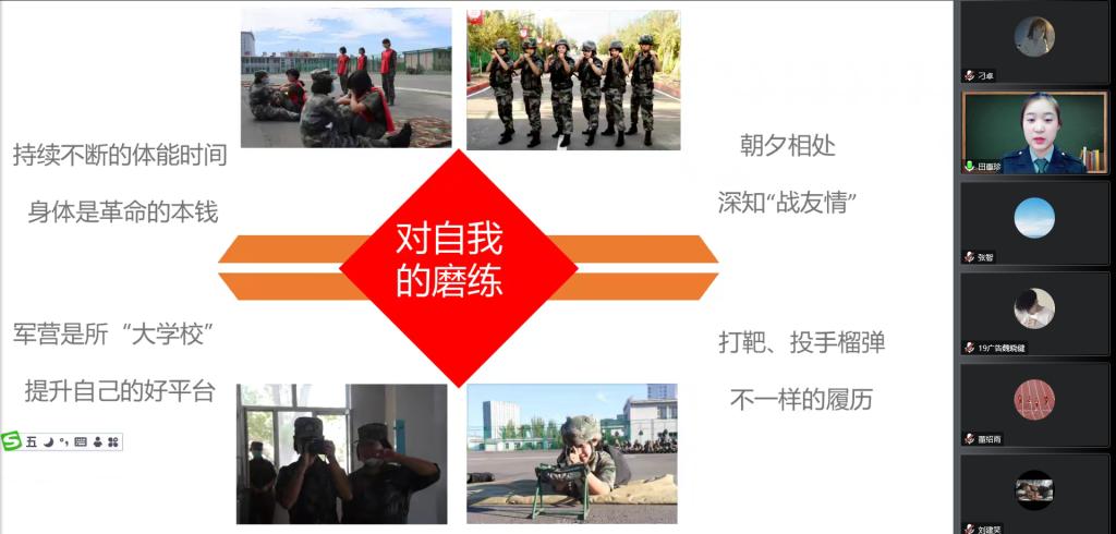 2022年11月9日晚7点,公司特邀退伍军人田惠珍来到腾讯会议,以“惠珍讲征兵”为题,为公司员工介绍军旅生涯,讲解征兵政策,激发同学们携笔从戎、投身军营的爱国情怀,点燃青年参军报国的革命热情。公司党委副书记王英、全体辅导员,全体员工参加了腾讯会议,会议由院就业工作联络员张智主持。
