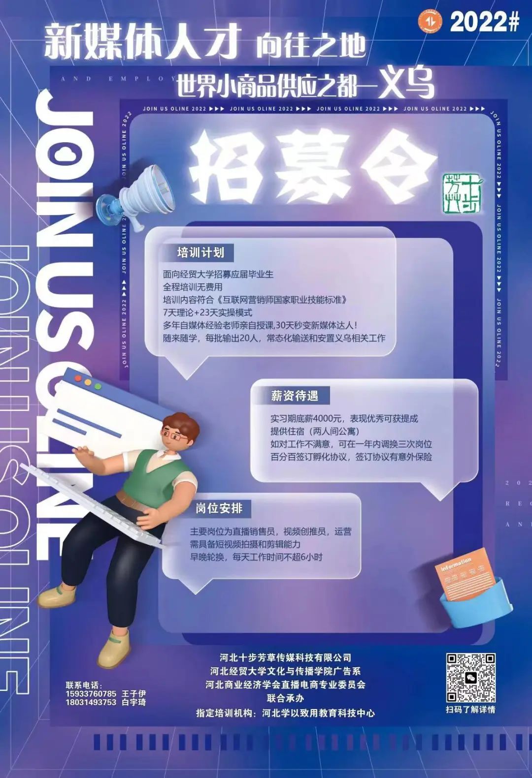 大家好,为向义乌输送优秀新媒体应届人才,现在河北学以致用教育科技中心将为suncitygroup太阳新城全体应届毕业生提供免费新媒体培训课程啦!整体培训时间为30天左右(7天理论+23天实操模式),培训岗位以直播销售人员、短视频创推及运营为主,培训内容符合国家人社部发布的《互联网营销师国家职业技能标准》,且一年之内免费复训。本次培训全程免费,培训后获得实习证即可签订孵化协议和劳务合同。详情请见文件。