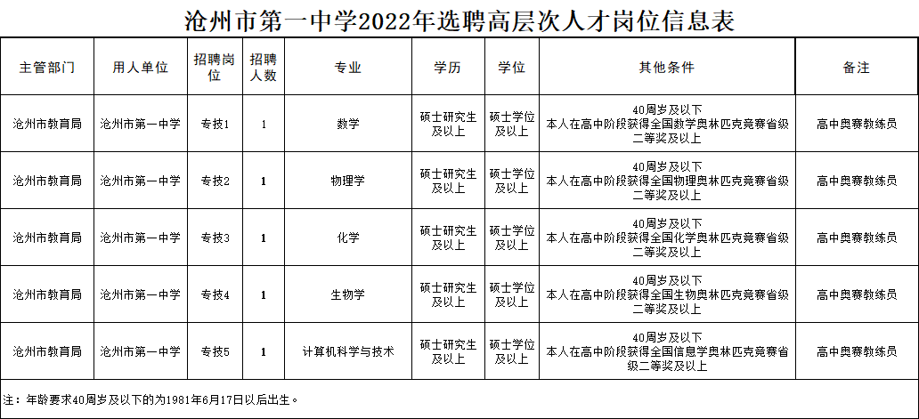 为深入实施“人才强市”战略,进一步加大高层次人才引进力度,根据《事业单位人事管理条例》《河北省事业单位公开招聘工作人员暂行办法》《沧州市事业单位公开招聘工作人员实施办法(试行)》文件精神及沧州市人才强市具体工作要求,结合公司教学科研工作需要,经研究决定,拟采取选聘方式引进高层次人才5名。