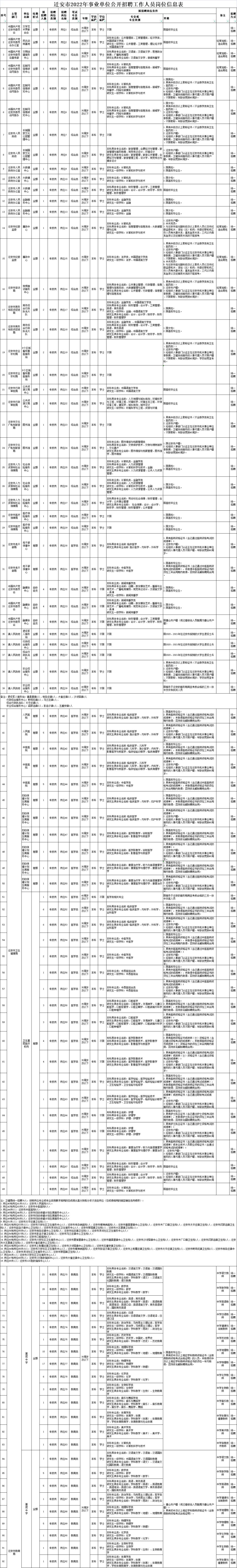 为满足迁安市部分事业单位工作需要,根据《事业单位人事管理条例》及《河北省事业单位公开招聘工作人员暂行办法》,经研究决定,面向社会公开招聘事业编制工作人员509名,其中教育系统基层学校招聘教师370名,卫健系统医疗机构招聘工作人员76名,市直事业单位招聘工作人员46名,各镇基层事业单位招聘工作人员17名。