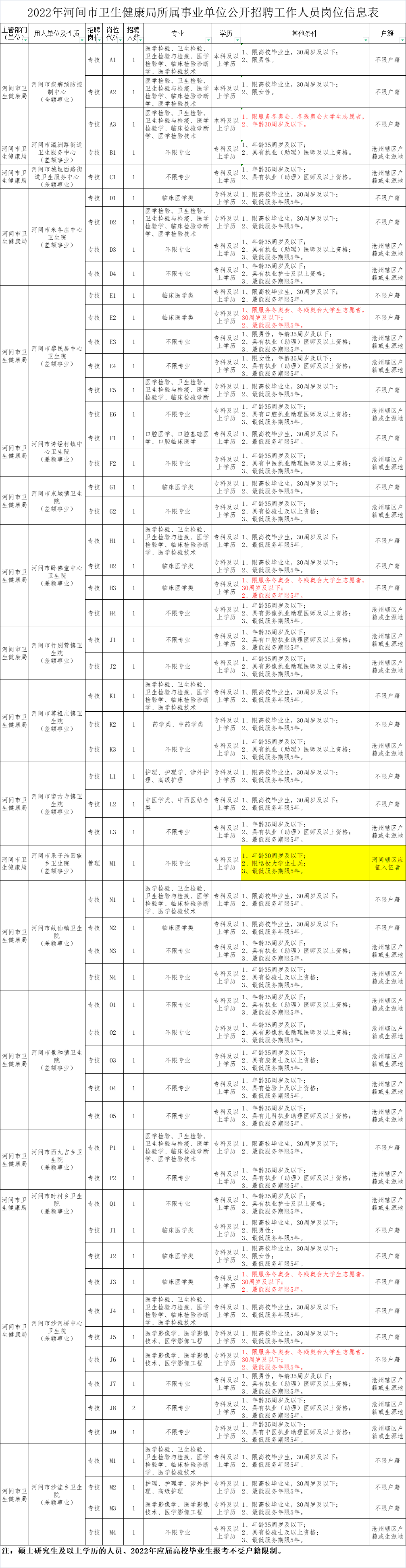 根据《事业单位人事管理条例》、《河北省事业单位公开招聘工作人员暂行办法》(冀人社发〔2011〕9号)、《沧州市事业单位公开招聘工作人员实施办法(试行)》(沧人社字〔2011〕133号)文件精神,结合我市工作实际和用人需要,经研究决定,拟面向社会公开招聘河间市卫生健康局所属事业单位工作人员58名。