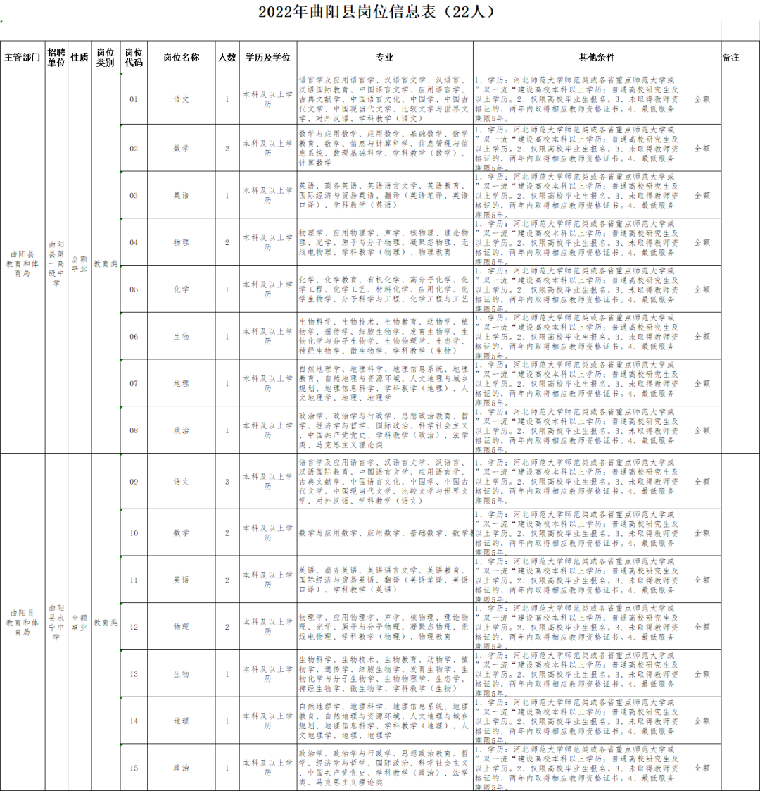 为满足我县第一高级中学、河北曲阳永宁中学对高层次人才和紧缺学科教师的需求,经县委、县政府研究决定,计划为曲阳县第一高级中学、河北曲阳永宁中学二所河北省示范性高中计划引进高层次人才22名。