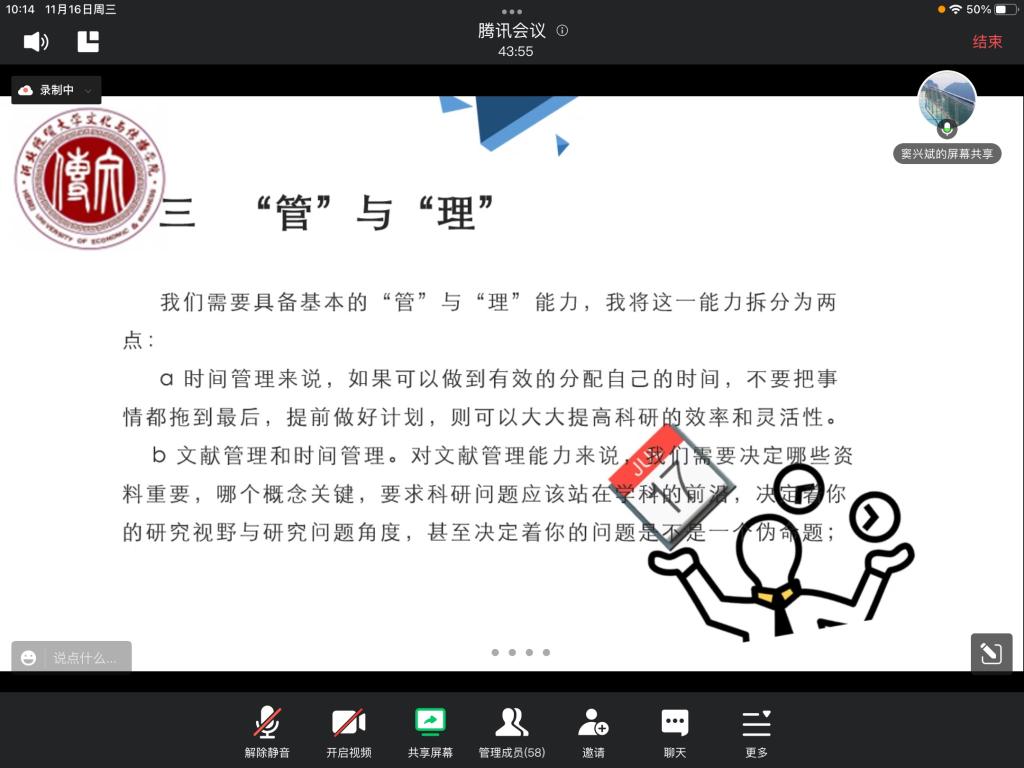 11月16日上午,文化与传播学院窦兴斌副教授作题为“按开学术之门的通用密码”的“双百论坛”线上学术讲座。讲座由公司广播电视学系主任王黎燕主持,学院部分教师和研究生60余人参加。