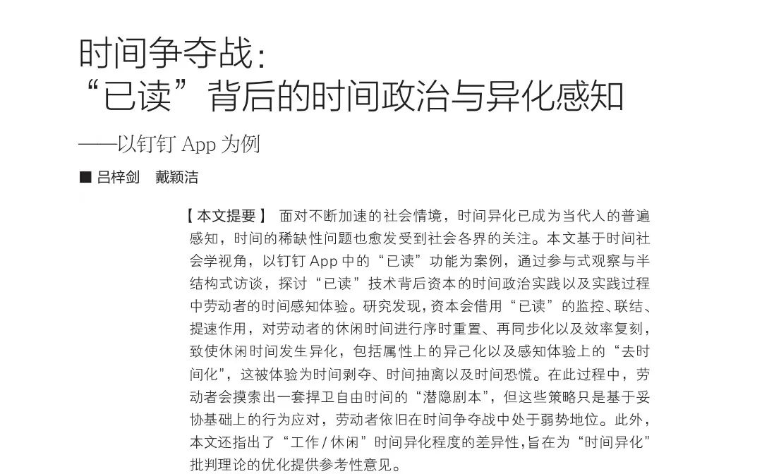 刘渊慧同学介绍了《时间争夺战:“已读”背后的时间政治与异化感知——以钉钉 App 为例》,讲述了面对不断加速的社会情境,时间异化已成为当代人的普遍感知,时间的稀缺性问题也愈发受到社会各界的关注。研究发现,资本会借用“已读”的监控、联结、提速作用,对劳动者的休闲时间进行序时重置、再同步化以及效率复刻,致使休闲时间发生异化,包括属性上的异己化以及感知体验上的“去时间化”,这被体验为时间剥夺、时间抽离以及时间恐慌。