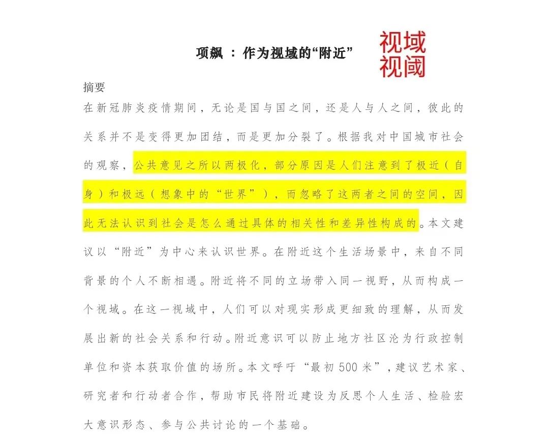 裴雪娇分享的是田浩的《项飙 : 作为视域的“附近”》,这篇论文讲述了在新冠肺炎疫情期间,无论是国与国之间,还是人与人之间,彼此的关系并不是变得更加团结,而是更加分裂了。本文呼吁 “最初500米”,建议艺术家、研究者和行动者合作,帮助市民将附近建设为反思个人生活、检验宏大意识形态、参与公共讨论的一个基础。