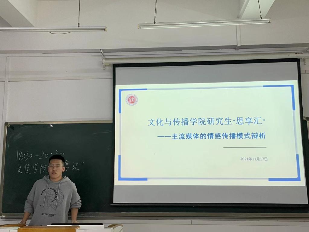 11月17日晚,文化与传播学院研究生会于B教104举办“思享汇——主流媒体的情感传播模式辨析”为题的学术研讨会,全体2021级研究生及部分2020级研究生参加。
