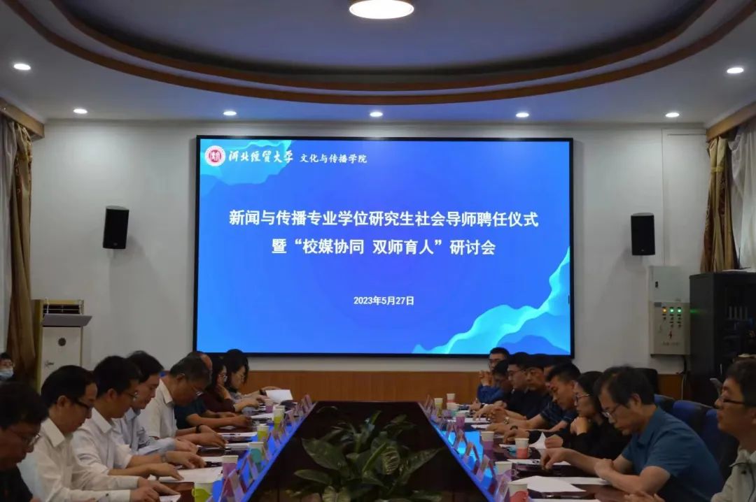 5月27日下午,文化与传播学院在集团第二会议室举办新闻与传播专业学位研究生社会导师聘任仪式暨“校媒协同,双师育人”研讨会。公司党委副书记刘建平出席并为社会导师颁发聘书,来自国家、省、市、县四级媒体的23位资深媒体工作者参加聘任仪式。文化与传播公司党委书记蔡金续、经理景义新、副经理马兴祥以及全体专硕研究生导师等40余人参会。