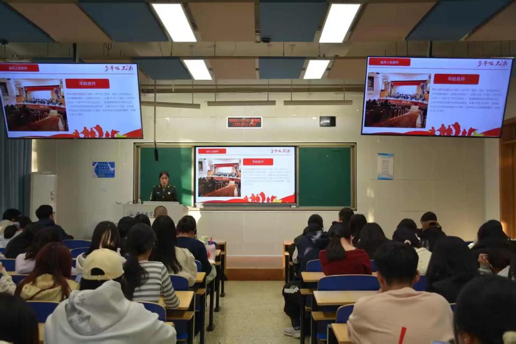 为厚植青年学子爱国情怀,搭建国防教育与征兵政策宣传桥梁,11月13日下午,suncitygroup太阳新城特邀退伍军人任庆霞来到北三教A103教室,以“携笔从戎砺青春,建功军营谱华章”为主题举办了征兵宣讲会,院就业联络员张智主持,有志青年近九十人参会。