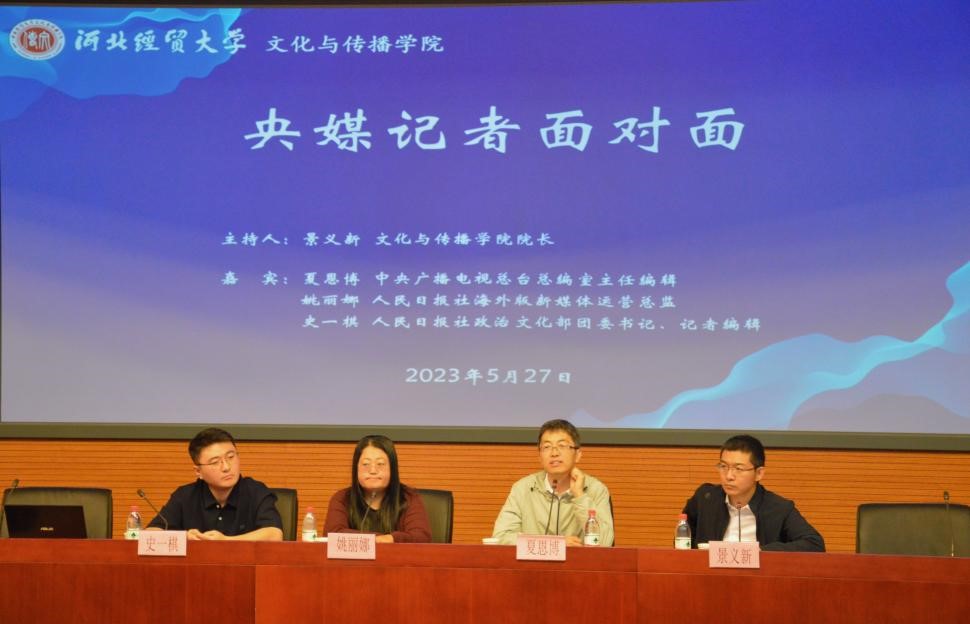 5月27日上午,文化与传播学院邀请中央广播电视总台总编室主任编辑夏恩博,人民日报社海外版新媒体运营总监姚丽娜及人民日报社政治文化部团委书记史一棋在国际学术报告厅作“央媒记者面对面”讲座,文化与传播学院经理景义新主持,学院100余名员工参加。