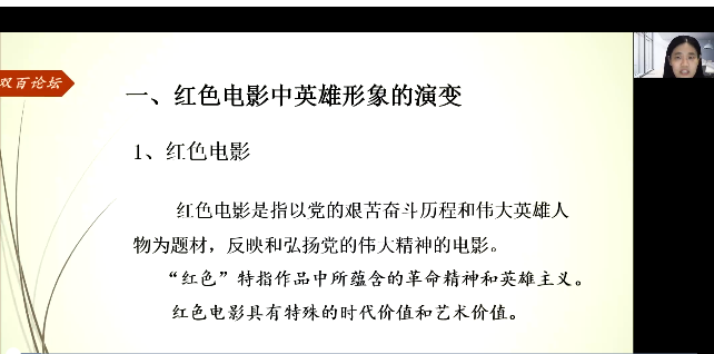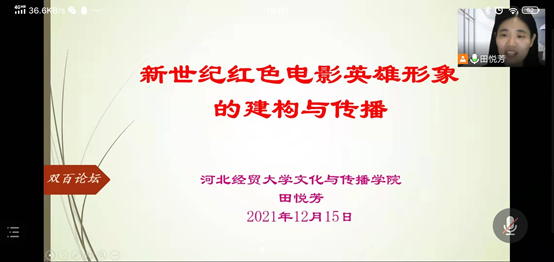 12月15日晚,公司举办“双百论坛”,田悦芳教授以“新世纪红色电影英雄形象的建构与传播”为题做线上报告。学院部分教师、员工共80余人参加。