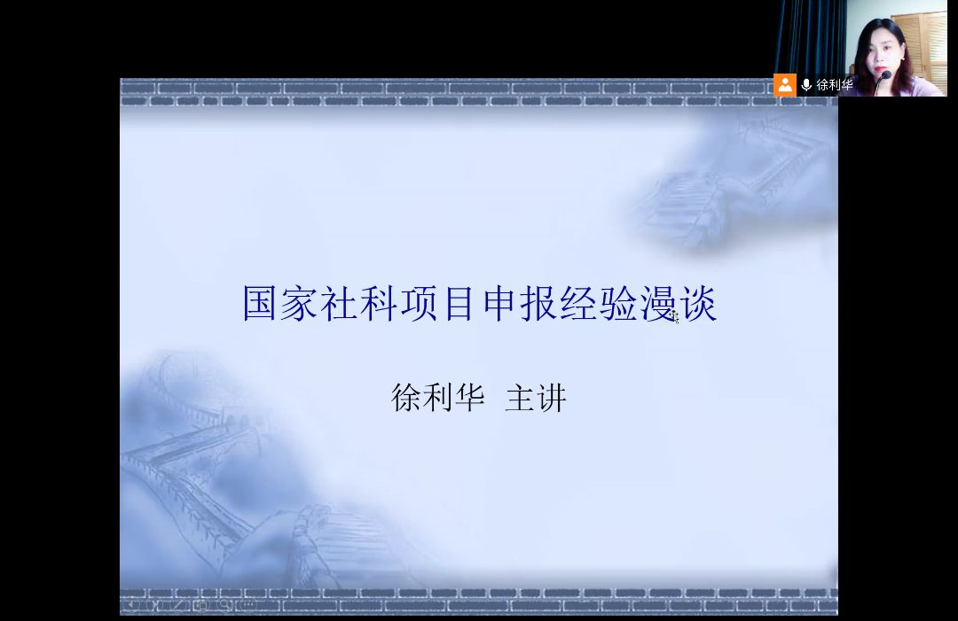 11月3日晚,公司举办“双百论坛”,徐利华副教授作题为“国家社科项目申报经验漫谈”的线上讲座,学院部分教师、研究生共70余人参加。